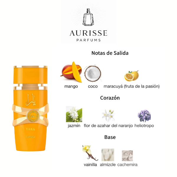 Yara Tous de Lattafa es una fragancia femenina exótica, fresca y envolvente que combina lo tropical con un toque dulce y suave, perfecta para quienes buscan un aroma veraniego y alegre. Desde la primera pulverización, se abre con una explosión vibrante de frutas tropicales donde el mango, el coco y el maracuyá aportan una sensación jugosa y luminosa, evocando paisajes soleados y energía positiva.