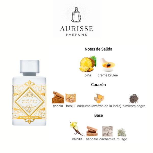 Bade’e Al Oud Honor & Glory de Lattafa es una fragancia unisex rico, cálido y gourmand que equilibra notas frutales y especiadas con una base cremosa y envolvente. Desde la primera pulverización, ofrece una apertura exótica y deliciosa de piña y crème brûlée, que aporta una sensación jugosa y dulce, como un postre aromático sobre la piel.