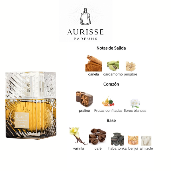 La fragancia se asienta finalmente en una base cálida, profunda y reconfortante dominada por notas de café arábica, vainilla, haba tonka, benjuí y almizcle, que otorgan una estela envolvente, sensual y duradera. Esta combinación hace de Khamrah Qahwa una opción destacada para quienes buscan una fragancia gourmand con carácter y presencia aromática.