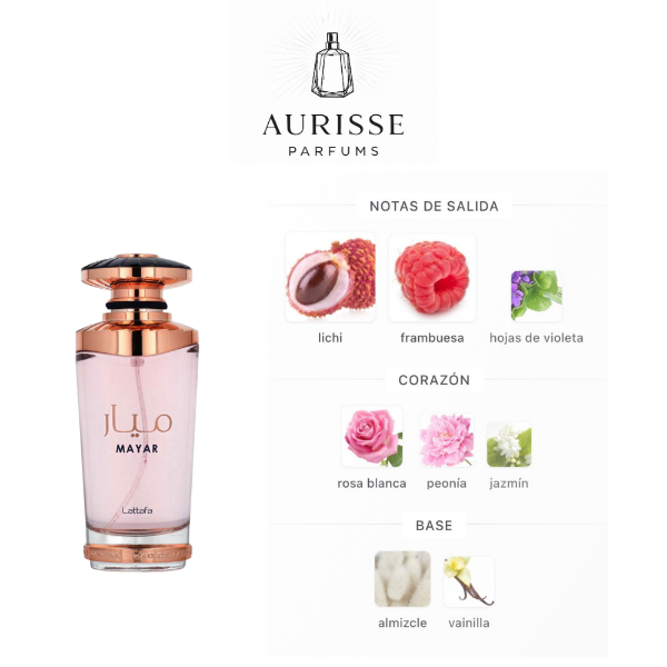 En el secado, el perfume se vuelve más suave y envolvente gracias a una base cálida de vainilla y almizcle, dejando una estela delicada, femenina y agradable sobre la piel. Mayar es ideal para quienes buscan una fragancia dulce y floral con un toque moderno y elegante.