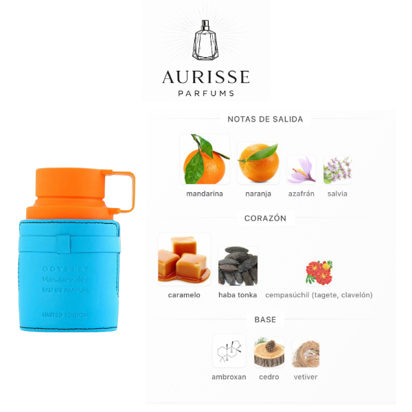 Odyssey Mandarin Sky de Armaf es una fragancia masculina dulce, moderna y envolvente que combina cítricos vibrantes con un fondo gourmand cálido y seductor. Desde la primera pulverización se percibe una apertura fresca y luminosa, donde la mandarina y la naranja aportan una sensación jugosa y energética, acompañadas por un toque especiado de azafrán y salvia que le da carácter desde el inicio.